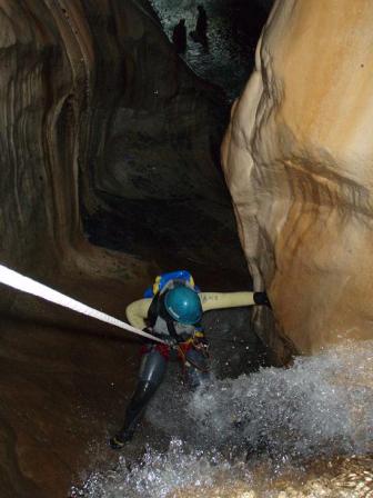 Bendola integral: Este es sin duda el «plato fuerte» de la cuenca del rio Roya, en Alpes Marítimos. Se trata de un cañon salvaje situado en una zona de naturaleza prácticamente virgen y con unas dimensiones extraordinarias: 1.400 m de desnivel en 15 km de recorrido en total, dimensiones que lo convierten en el más largo de toda Europa. Se debe realizar en dos jornadas con un vivac intermedio a mitad de recorrido, lo que implica una preparación especial, tanto física y logística, como sobre todo psicológica. El ambiente es extraordinario, tanto por las enormes dimensiones como por los parajes recorridos sobre el cauce de roca caliza que presenta unos plegamientos de gran belleza en la roca en varios tramos. La primera jornada discurre prácticamente colgados del arnés, dada la gran cantidad de rápeles, aunque tambien existen algunos tramos horizontales. El primer tramo del barranco es seco, desde el nacimiento del mismo en el alto del Col de Marta, hasta las primeras pozas que aparecen tras unas 3h de recorrido. El rápel más largo tiene una altura de 45m, y en esta jornada se encadenan unos 35 rápeles de entre 10 y 30 m. Casi ninguno de ellos es saltable. Además, dada la presión psicológica por la gran dificultad que puede suponer un recate en este barranco, motivada por una simple torcedura de tobillo, tomamos las máximas precauciones y prácticamente no hicimos ninguno. La segunda jornada es totalmente acuática, con largas badinas que se recorren fltotando y nadando cuando el cauce lo permite, que es con bastante frecuencia. El generoso caudal de este segundo tramo ha hecho que se acumulen importantes barreras de troncos y piedras en varios tramos, lo que obliga a realizar algunos destrepes delicados. Absolutamente imprescindible – para los que no se conforman con menos :-).