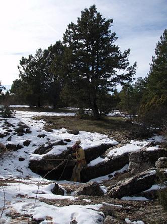 El sábado 21 de diciembre hacía sol, buena temperatura, capa de nieve caída la semana anterior, un buen día para ir a la sierra a patear… así que Jorge, Rafa y yo (Montse) nos fuimos de cuevas. Como en el club no localizamos la guía de Simas de la zona Centro, tuvimos que recurrir a internet, y en la página del Club Abismo de Guadalajara, encontramos la sima más profunda de Valsalobre, la Cierva, que exploraron en el 2003 y que alcanza los 153 m de profundidad.