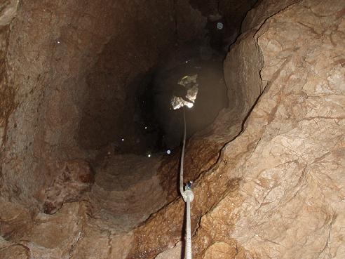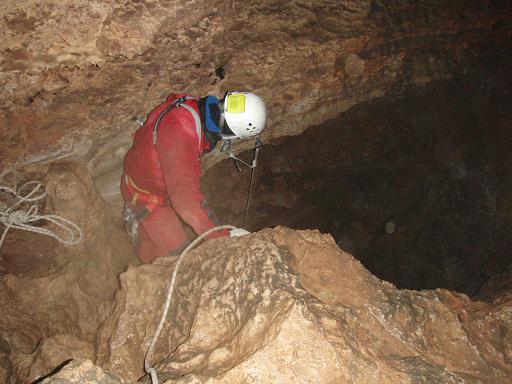 seguimos a la izquierda por otra rampa estrecha para llegar a la cabecera del pozo de 30 que comienza con dos pasos estrechos verticales, en los que hay que hacer esfuerzos para poder colarse enseguida se ensancha, a pocos metros de la base se ponen los pies en un gran bloque donde junto al fraccionamiento en un natural montamos un desviador para evitar el roce del bloque, bajando se ven varias coladas.