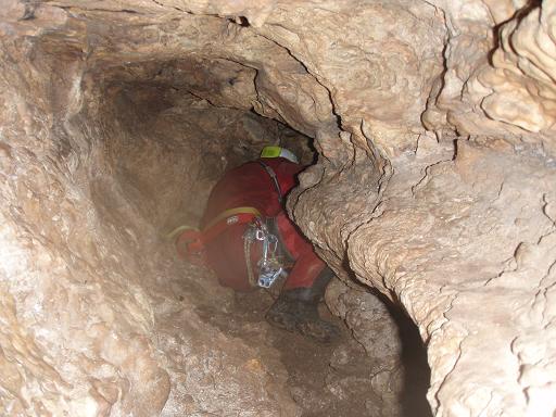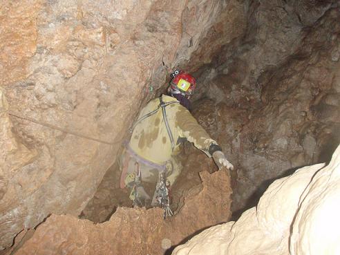 Tras el pozo nos metemos por una gatera descendente que es un meandro donde al final de este aparece un pequeño hilo de agua, que nos lleva a la cabecera del P17, que tiene un pequeño roce a unos 2 metros de la cabecera, la base es una repisa donde la diaclasa se divide en dos pozos, los P52 decidimos tomar el ramal este, pero enseguida vemos que le falta la placa al parabolt, por lo que volvemos al ramal oeste, es un pozo amplio, según bajamos encontramos una gran laja vertical que hace dudar a Jorge por que lado tomarla pero enseguida localiza la siguiente fraccionamiento en la misma pared un metro más abajo, pero no se evita un pequeño roce. Llegamos a la base del pozo que es un caos de bloques en una estrecha galería como en forma de L.