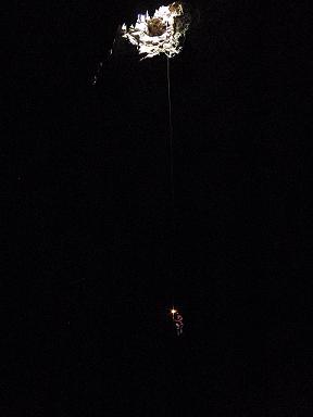 La entrada, de unos 3 x 3 m enseguida se convierte en un impresionante volao de 56 m en medio de una gran bóveda en una gran sala, del techo cuelgan grandes estalagtitas.