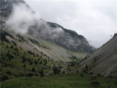 Otra vez nos levantamos corriendo por la lluvia, nos vamos hacia el Valle de Añisclo. Tras 4 horas de ascensión entre las nubes y atravesando un espectacular bosque de hayas, abetos y tejos, la Selva Plana y la Ripareta, llegamos al circo, nos situamos bajo la Cascada de la Font Blanca donde hay un pequeño refu y un vivac. Comemos algo vigilados por los quebrantahuesos, y el día se despeja, dejandonos ver el Collado de Añisclo y los paredones de este valle, que podemos admirar en el descenso.