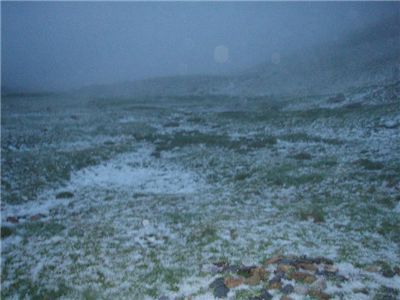 6:30 a.m. Pum, pum,pum. ay, ay, nos atacan!!! de repente el agua empieza a correr entre los cortezones y casi nadando recogemos a gran velocidad. Granizos como nueces nos han hecho más de diez rajas en el doble techo de la tienda. Nos vamos….