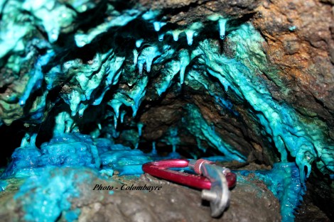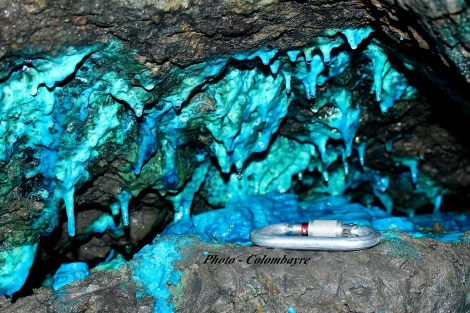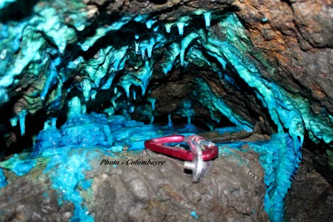Llegados al lugar, una charlilla, se reparten las tareas, se aplican protocolos y un compañero comienza la instalación acompañado de otro veterano. Poco a poco vamos bajando en primer pozo y rápidamente nos damos cuenta uno tras otro que nos encontramos con una maravilla de la naturaleza: Los tonos van desde el azul turquesa mas nítido al verde grama. La primera galería nos lleva a otro pozo en el cual las tablas de madera se tornan del marrón mas oscuro al blanco y un azul muy intenso. Parada obligatoria para un selfie. Al final del pozo otra galería nos lleva a unas formaciones que simulan dunas del desierto en escalera. Aquí aparece también el color verde, seguimos otras pequeñas galerías, estalactitas azules, blancas, marrones, una fascinación. La naturaleza no tiene limites, lo que puede hacer el agua con mucha paciencia.