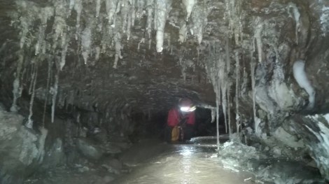 Pues bien, ya puestos en modo espeleo, arrancamos. El itinerario a seguir es muy evidente. De ida, río arriba. Tomamos desde la misma entrada la izquierda. Un paso, ya meandriforme, nos da vista a una sala aún más grande que la entrada. Aquí ya el río se presenta como verdadero protagonista de la actividad. En nuestros primeros pasos y avanzando por un caos de bloques, evitaremos el agua por sendos flancos. A pesar de haber numerosos hitos, la anarquía en la decisión de nuestros accesos, unas veces de pie, otras gateando y otras arrastras, es lo más lógico. En nuestro recorrido siempre tendremos el mismo referente, el Pisuerga. Una vez superado el caos de bloques, el camino se acomoda, adquiere venustidad, el meandro se tapiza de multiformes betas, cada giro es un obsequio para los ojos. De vez en cuando algún paso de agua nos despertara de este sueño para evitar mojarnos a niveles indeseables. En la ida, siempre a nuestra izquierda, alguna cuerda en fijo, en pasamanos y en tirolina nos ayudará a superar algún baño que otro. En este sentido nos vino bien llevar algo de cuerda dado que la tirolina, severamente traída, tuvo que retirarse y sustituirla por cuerda nueva.