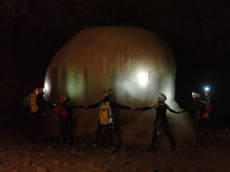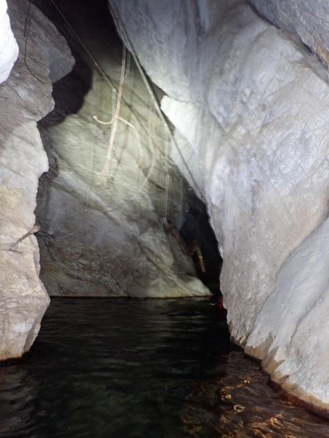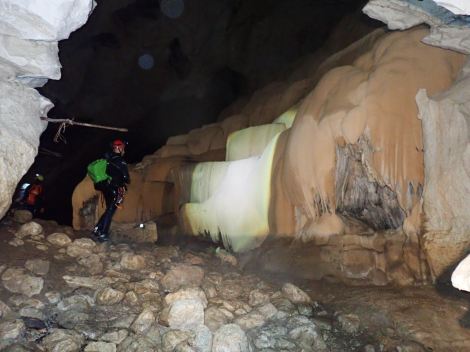 El sábado nos levantamos pronto y hacemos dos grupos ya que somos 18. Nos vamos hacia Hundidero a dejar a los compañeros y nos llevamos los coches a la salida de Gato. Sobre las 12 ya estamos entrando el primer grupo por la boca de Hundidero, la cual es bastante impresionante, la travesía comienza andando a través de bloques hasta que llegamos a un primer rápel, el cual instalamos, un segundo rápel nos coloca en el agua, y a partir de entonces empezamos a encontrarnos con una estructura de hierros y pasarelas derruidas pertenecientes a una obra de ingeniería realizada y fallida en los años 20 para intentar controlar el curso del agua dentro de la cueva. Seguimos alucinando con estas estructuras que nos muestran lo absurdo que a veces es el hombre en intentar dominar la naturaleza, y así seguimos nuestro camino superando pequeños resaltes y cruzando badinas hasta llegar primero a “Los Organos» y después a “La Sala de los Gours” disfrutando de estas bellas formaciones. Después de pasar por la “Galería de la Ciénaga”, en la cual mas de uno casi pierde las botas presas del barro, llegamos a la «Plaza de toros» para seguidamente llegar a la “Gran Estalagmita” donde nos hacemos unas fotos antes de proseguir, y después de pasar por varios lagos más llegamos a “La galería del aburrimiento», la cual pasamos rápidamente para acceder a la “Sala de las Dunas” y seguimos andando entre bloques hasta llegar a los últimos lagos antes de la salida por la boca de Gato, la cual alcanzamos después de 5 horas.