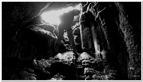 Marta e Irache, cual aguerridas Thelma y Louise, ya en modo ON FIRE, comienzan con la instalación. Seguro y reaseguro en un árbol y desde otro un desviador que evite el roce. Un cielo cruento concomitado por algún trueno a la lontananza nos hace movernos céleres. Yess modula el desviador conforme vamos bajando. Ya solo queda uno. El granizo es intransigente pero verlo entrar por la boca compensa. Un rapel en rampa muy cómodo, visible desde el exterior, de unos ocho metros, nos pone al grupo en nuestra primera sala. Denominada como Sala del Pastor se nos muestra de empaque alargado y dimensiones considerables. Una rampa descendente, bien iluminada en su inicio por la luz exterior, nos empuja hasta el centro de la sala. Aquí y a nuestra izquierda, dos parabolt instalados a cierta altura indican la continuación. También en la pared derecha, unos metros más hacia el fondo de la sala, un estrecho paso con una instalación vetusta se insinúa como posible continuación.