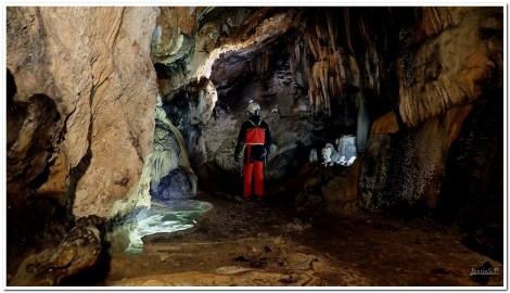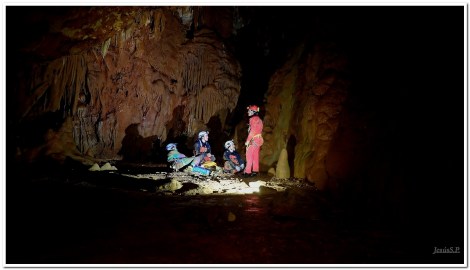 Bellos rincones semiocultos componen el zócalo de las paredes de esta sala, de suelo plano y tabiques que guardan la sintonía de las anteriores estancias, imponentes banderas al fondo, espeleotemas que solicitan su inevitable atención suspendidos del techo, gours, excéntricas…, todo a pedir de boca. Una sala colgada nos deja con la curiosidad, pues lo único que nos tienta son unos inalcanzables parabolt instalados a modo de pasamanos.