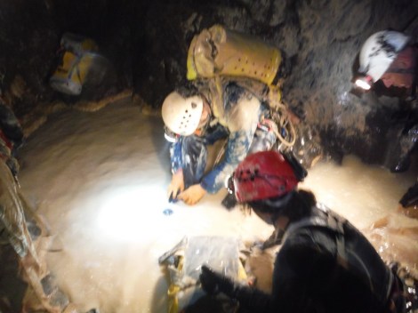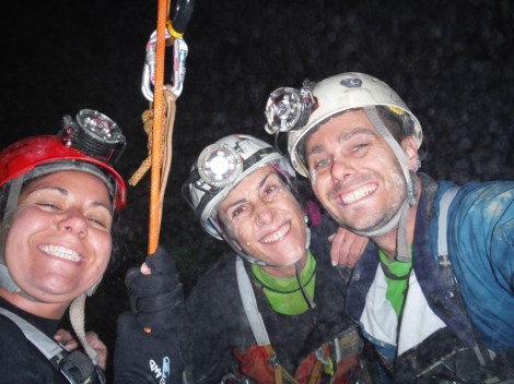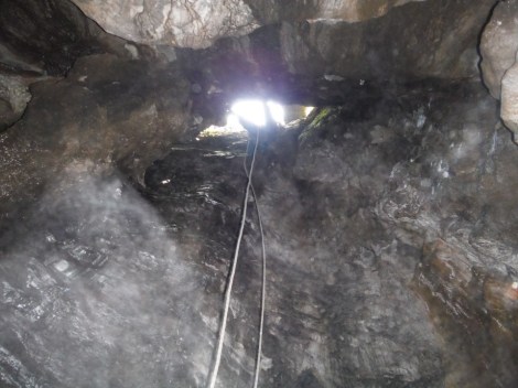 Tras quitarnos algo de barro de hasta dentro de las botas, nos metimos en el meandro de falopio sin más complicación que buscar el mejor paso, sobre todo para las sacas que portan la colección íntegra de pelis de Bud Spencer, bien por arriba o por abajo a elección del consumidor (qué cabrón Moi que ha descubierto el secreto del botón!!!). El meandro termina en una cuerda fija que te deja en una poza tras un ratito de restregarse. Un poco más adelante, una cuerda en fijo de bajada y a los pocos metros otra de subida…En este punto nos volvimos a dar cuenta que el mundo está cambiando. Algo raro pasa… cuando Rafa iba a subir como muchas otras veces obviando la cuerda Miguel «the busdriver» le chistó y le dijo «no irás a subir así!!»