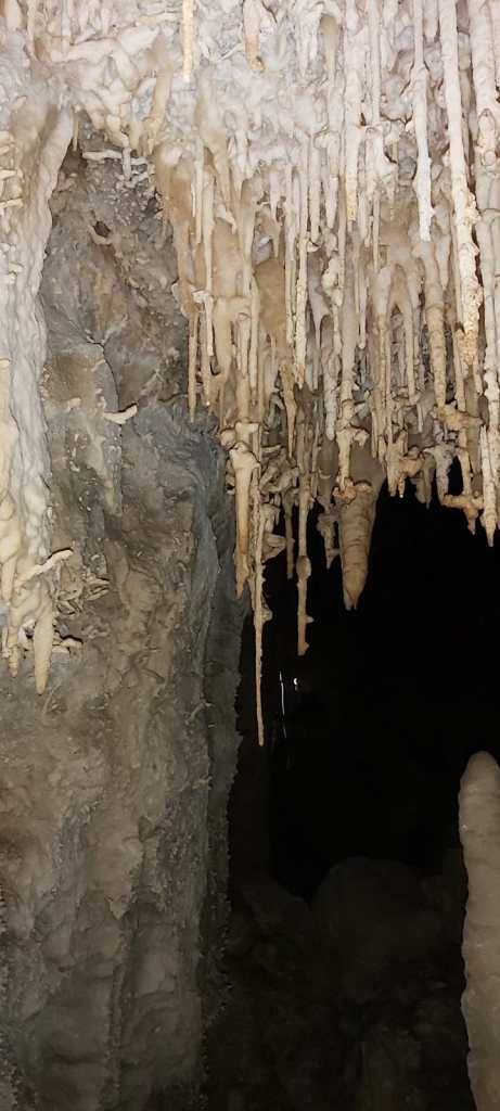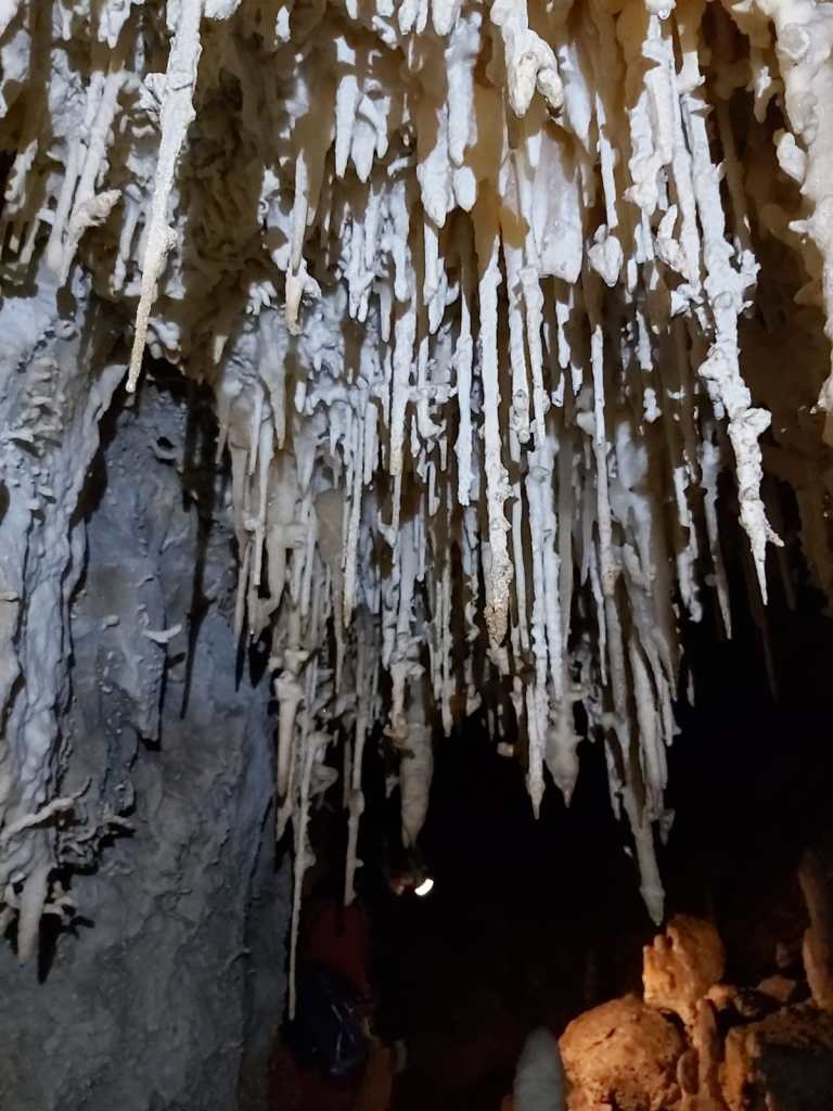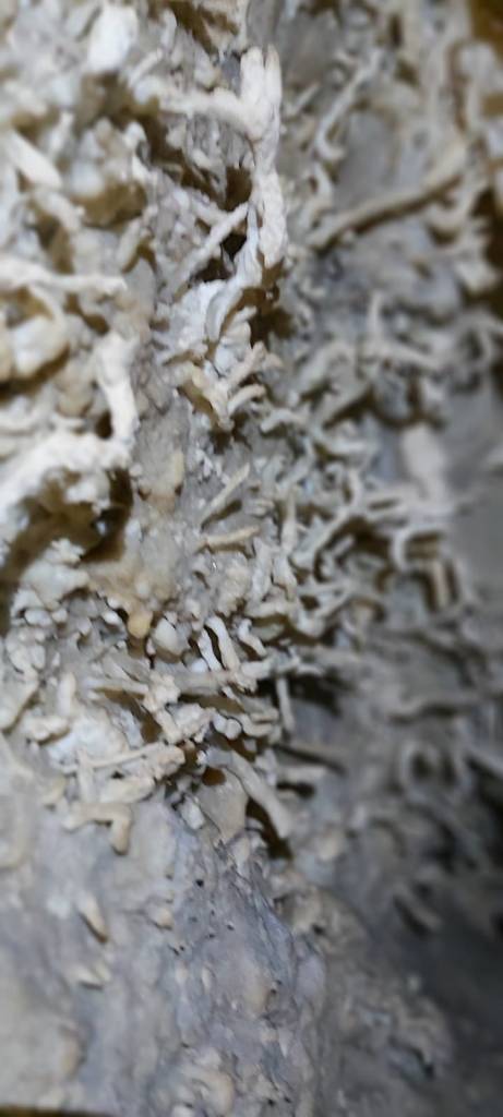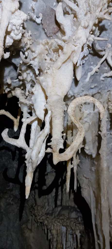 Una vez abajo se puede disfrutar de un par de salas con magnificas concrecciones: En la primera sala accesible con un pasamanos que se encuentra a unos 10 m. del fondo, hay un techo semi-desprendido totalmente forrado de excentricas. Y ya en el fondo, situados de espalda a la pared por la que se baja, en la zona de la izquierda hay otra pequeña salita a la que se accede por un agujero tras una corta trepada con excéntricas de mayor tamaño y de un color blanco más puro. entre ellas destacan un «gancho» y un «mosquetón» de caliza.