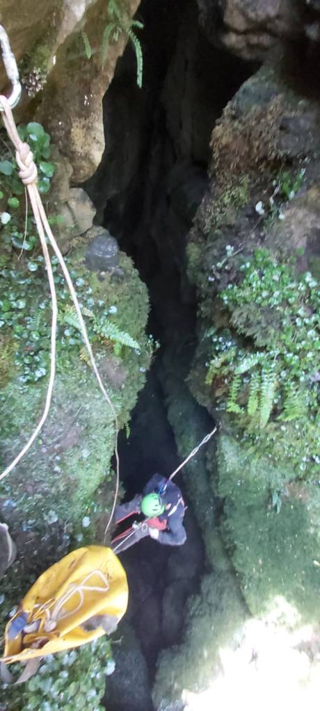 En la entrada, semioculta por la vegetacion, se intuye ya la oscuridad de una torca. Tras re-equipar con 2 parabolts la cabecera de entrada, iniciamos el descenso, inicialmente atravesando la broza existente durante los 3-4 primeros metros, y para evitarla colocamos una larga saca de Juanito de unos 2 m de longitud. Como el equipamiento existente era de ataque de exploración, la tarea principal consistía en equipar puntos de fraccionamiento adicionales para evitar roces de cuerda. En total se colocaron 4 anclajes adicionales, incluyendo un desviador al comienzo de la vertical tras la primera repisa cómoda donde es posible esperar de pie a que progresen el resto de compañeros.