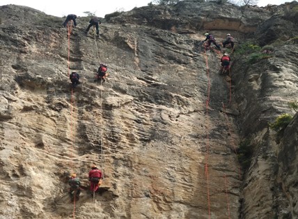 Una vez familiarizadas con la teoría, el primer contacto práctico lo tuvimos en las paredes del Pontón de la Oliva (Patones), donde empezamos ascender y descender por primera vez en una pared totalmente vertical, haciendo uso del equipo y material de espeleología, y pasando todo tipo de obstáculos que podríamos encontrar en las cuevas, como nudos, fraccionamientos, pasamanos y péndulos.