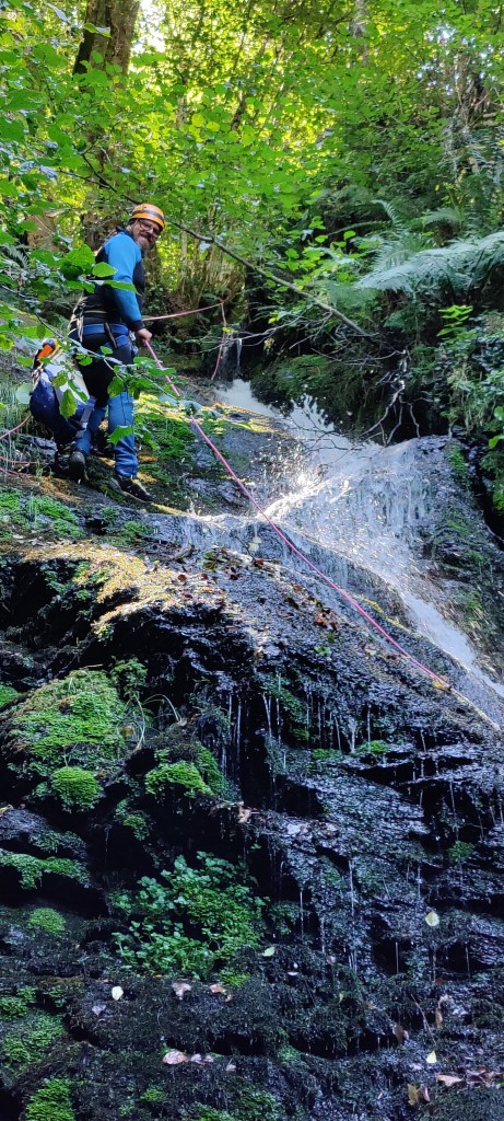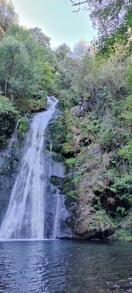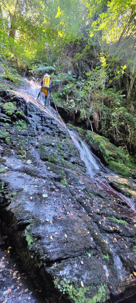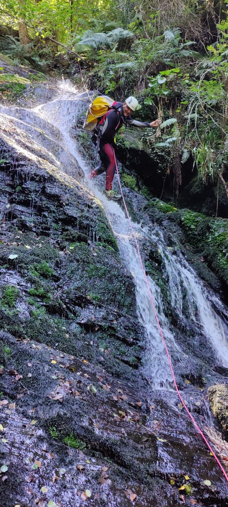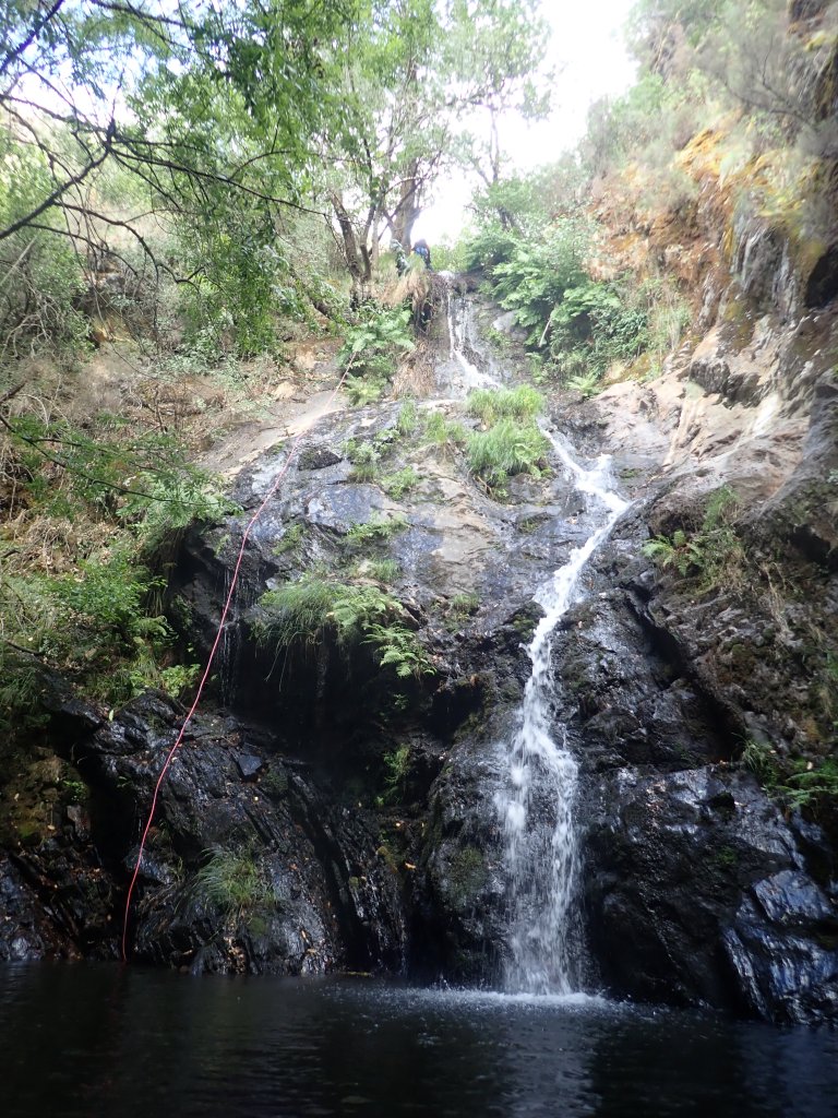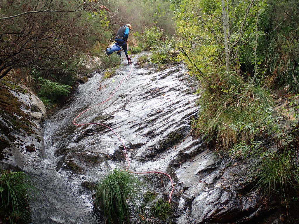 Tras terminar el barranco de ACEVAL, encademos este otro barranco. Arranca con la hermosa cascada “Fervenza de Vieiros”, que se realiza por la vertiente izquierda del río, totalmente por fuera del agua. A pesar de que la guía indica que para evitar el roce de la cuerda se puede hacer en dos tramos, con una segunda instalación unos pocos metros más debajo de la primera, nosotros no la encontramos. No nos supuso mayor problema colocando un antirroce en el punto de fricción de la cuerda con la roca.
