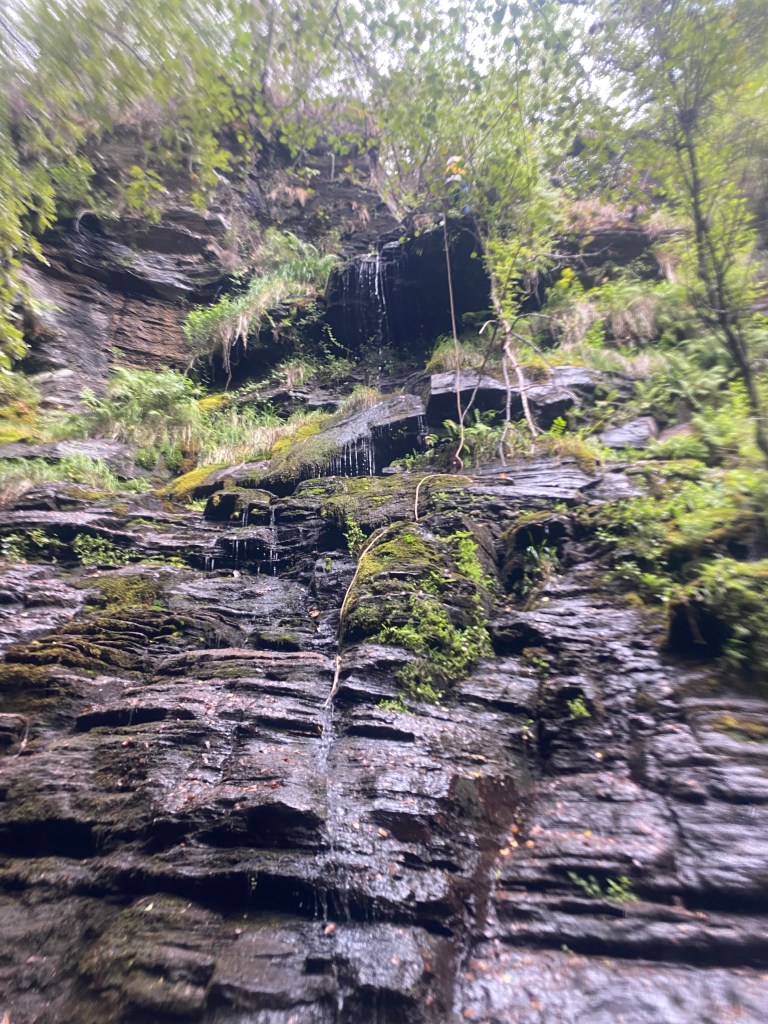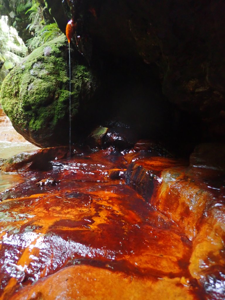 El barranco es una auténtica maravilla geológica. La primera parte es la más espectacular, con espectaculares formaciones ferruginosas de colores rojizos y naranjas, como estalactitas, columnas y hasta plantas petrificadas. Estas formaciones, en tanta abundancia y calidad, no las hemos encontrado en ningún otro barranco del Courel (y me atrevería a decir que en ninguno de los cientos de barrancos que he realizado). El resto del barranco es entretenido, con pequeños resaltes y destrepes, con un interés siempre mantenido. El caudal era bajo, pero suficiente para “decorar” el recorrido.